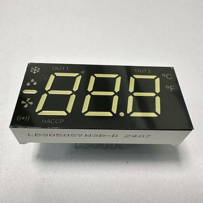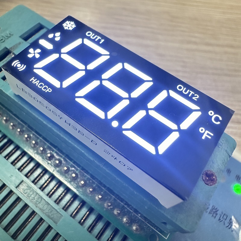 Multi-color 3 1/2 digit 7 segment LED display designed for kitchen hood applications with ultra bright white illumination.